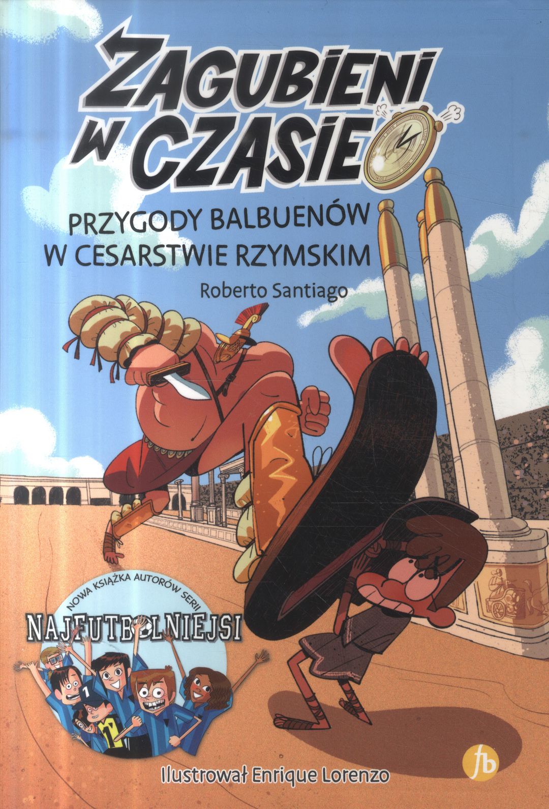 Wydostaliśmy się ze średniowiecza, ale z tymi czarnymi dziurami nigdy nic nie wiadomo. Zamiast domu, naszym oczom ukazał się pustynny krajobraz oraz armia legionistów. Trafiliśmy do Cesarstwa Rzymskiego, gdzie czekał nas los niewolników. Nie wyglądało to najlepiej, a już najgorsze były walki w rzymskim cyrku, bo kto z naszych czasów chciałby zostać gladiatorem albo walczyć z groźnymi zwierzętami? Trzeba jakoś stąd uciec! Może dorośli coś wymyślą? A może Santi, Zuza albo Klara? Seria "Zagubieni w czasie" to cykl książek napisanych i zilustrowanych przez twórców bestsellerowej serii „Najfutbolniejsi”. Ich bohaterami jest zabawna rodzina Balbuenów oraz ich sąsiedzi, którzy za sprawą niewytłumaczalnych zdarzeń przenosizą się w czasie w różne epoki historyczne. Seria jest adresowana do dzieci w wieku 6-12 lat. Trzeci tom przygód rodziny Balbuenów, która w tym tomie przenosi się w czasy Cesarstwa Rzymskiego. [Powyższy opis pochodzi od wydawcy].